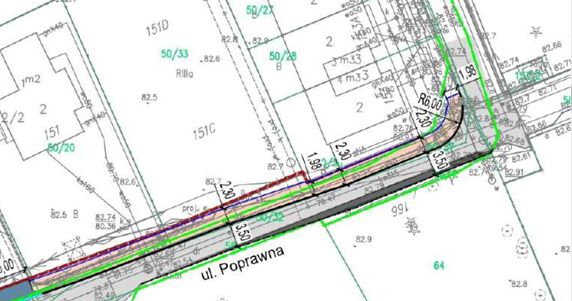Praktycznie na całej długości przebieg chodnika został zaprojektowany zgodnie z linią rozgraniczającą drogi 4KDL mpzp, oprócz… najbardziej newralgicznego fragmentu na wysokości posesji Poprawna 153. Zapewne, aby jak najmniej ingerować w wydzierżawiony teren i tym samym w interes prywatnego właściciela. To poskutkowało zawężeniem drogi asfaltowej (na znacznym odcinku) do 3,5 metra. Nowa geometria łuku wymusiła poprowadzenie na zakręcie skrajni drogi przez prywatną działkę i zjazd. Taki projekt nie ma nic wspólnego z polepszeniem obsługi komunikacyjnej, która była powodem zawarcia umowy z art. 16, czy poprawą bezpieczeństwa oraz warunków życia dla mieszkańców.