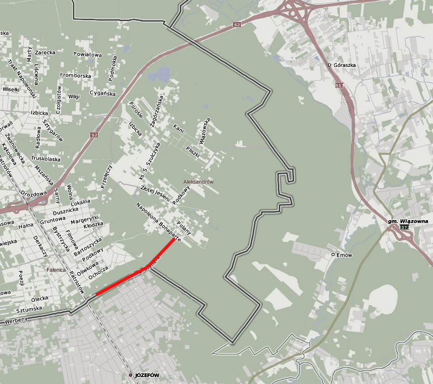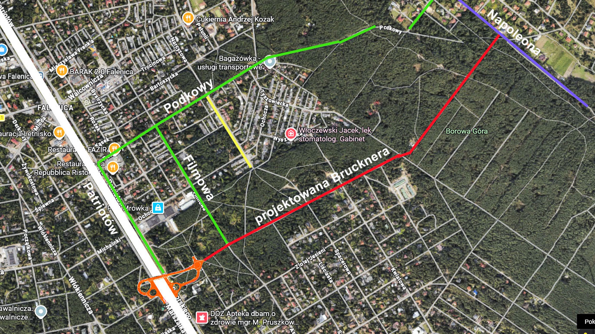 Czy przedłużenie ul. Brücknera (kolor czerwony) do ul. Napoleona (kolor fioletowy), przecinające wydmę porośniętą lasem – to jedyne, najlepsze rozwiązanie? No bo skoro miałoby to być połączenie ul. Patriotów z ul. Podkowy to od Brucknera do Podkowy jest jeszcze ok 350 metrów łącznika do wykonania… A może to projektowane przedłużenie o 1650 metrów miałoby legitymizować sens powstania wiaduktu? Może w czyjejś głowie rodzą się już plany dalszej dewastacji aleksandrowskiego lasu i przedłużenie Brucknera do granic Warszawy w kierunku Wiązownej, przez sam środek MPK?